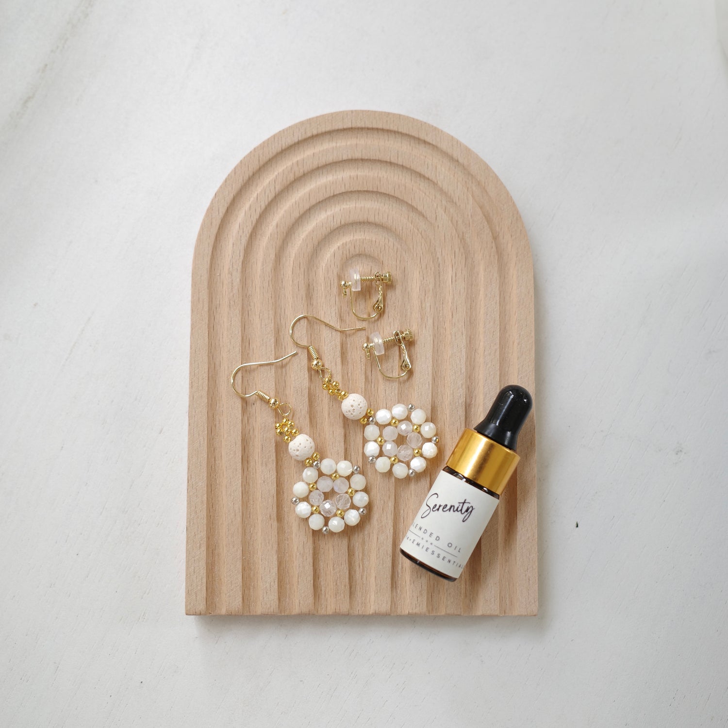 自然の恵み、天然石とアロマのコラボレーション第二弾。 天然溶岩の部分にアロマを垂らして香りをお楽しみ頂ける、天然石を贅沢に使ったピアスとブレンドエッセンシャルオイルのセットです。 アロマを垂らした天然石ピアスが、耳元で揺れるたびに香りを鼻に運んでくれる。 心地良さとオシャレが同時に叶う、新しいアイテムです。 また、イヤリングにも対応可能です。 今回の【&e】新作モチーフは、天然石で花輪をイメージして1つ1つ手作業で作りました。 epittaでは『花輪』には特別な思いがあります。 それはマラビースの『マーラー』。サンスクリット語で『花輪』です。 両耳で可憐に揺れる『花輪』を楽しんで頂けたら嬉しいです。 EMI ESSENTIALSとのコラボなので、ハーブや花をイメージしてこのモチーフにしました。