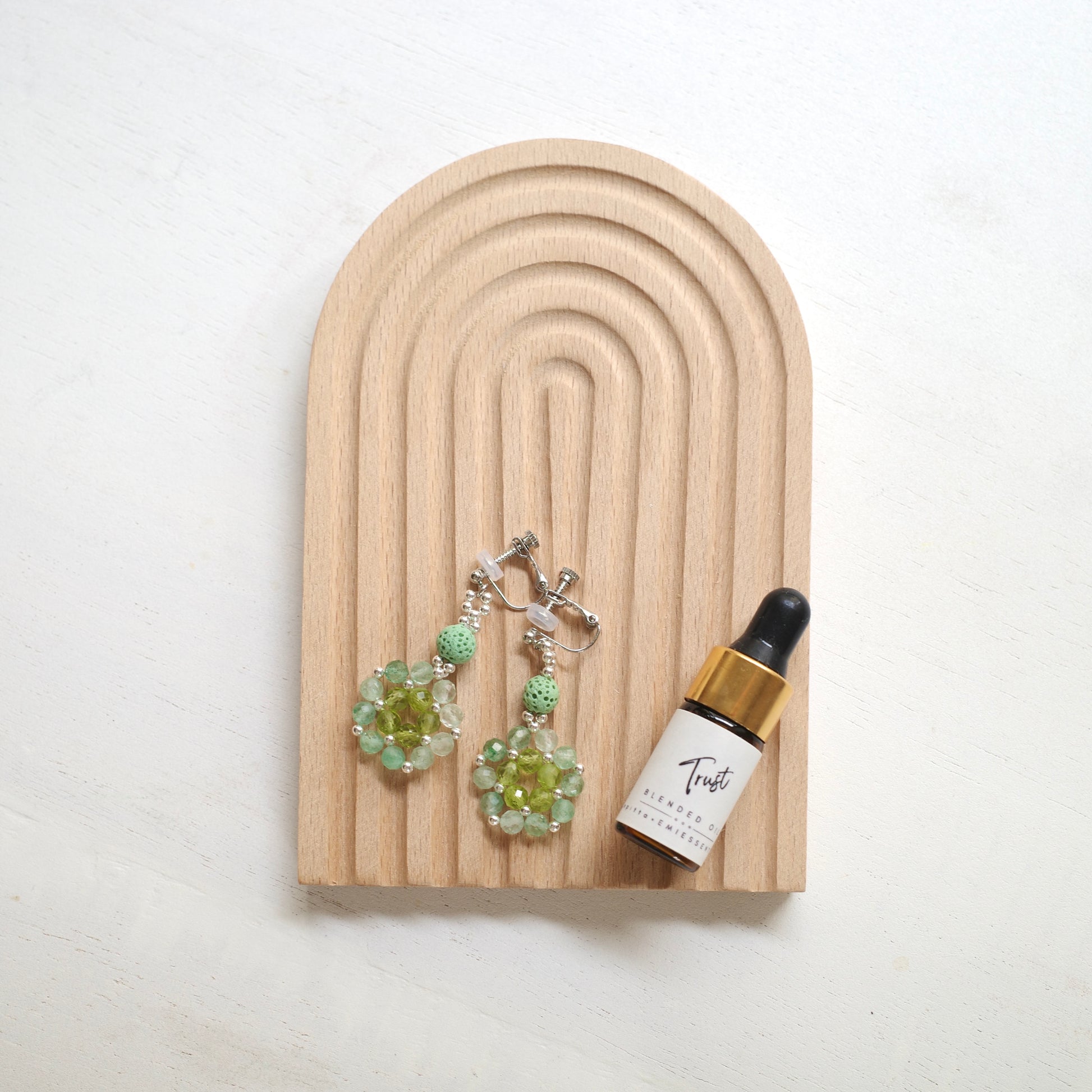 爽やかな Greenピアスと、TrustブレンドまたはBloomエッセンシャルオイルどちらかの組み合わせをお選びいただけます。(カートに入れる前にお選びください)